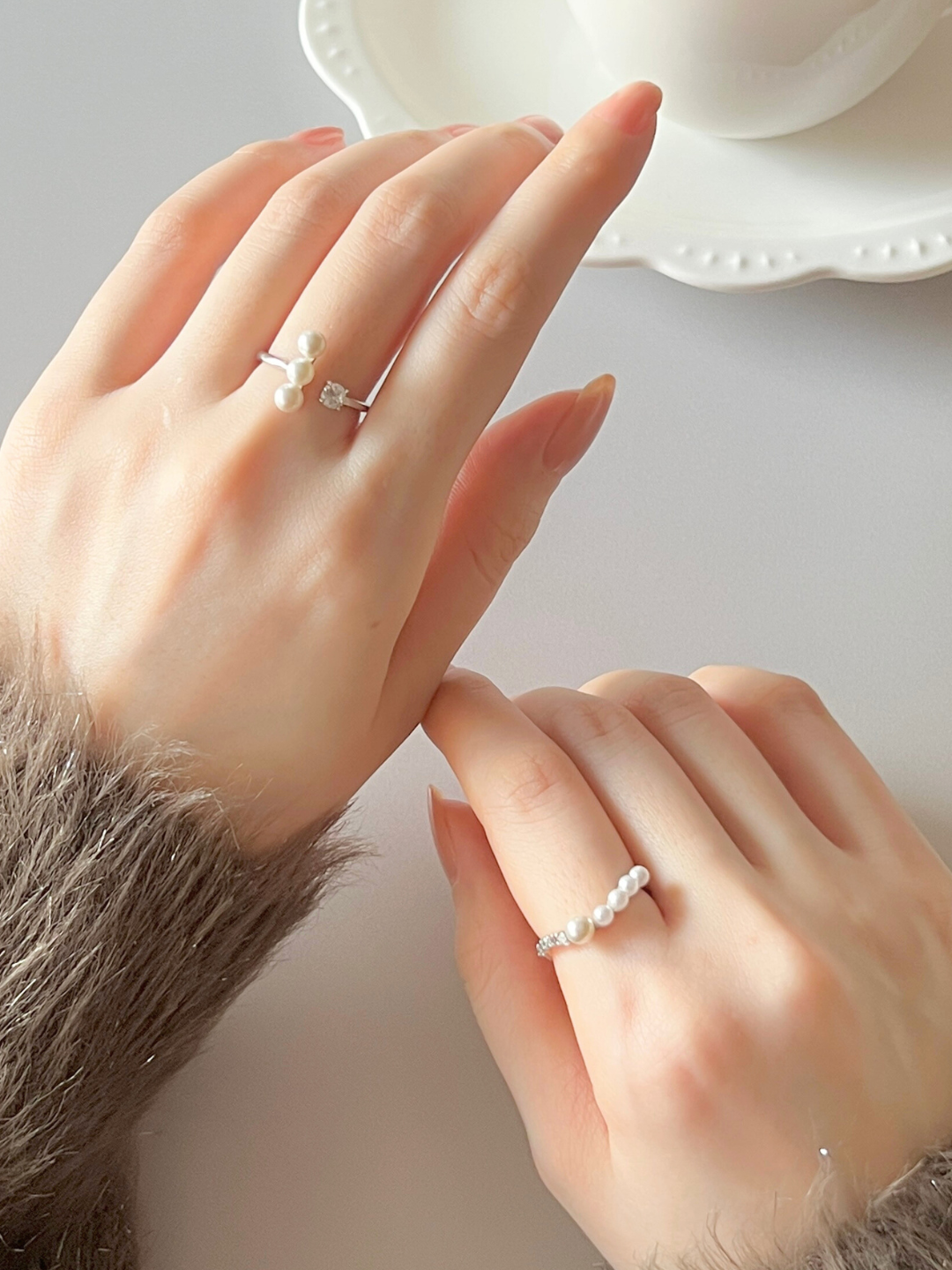 横にジルコニアやパールが連なるデザインですが、ウェーブの形をしていることで、横だけでなく縦のニュアンスもあり、華がありつつも指を長く見せてくれるリングです。